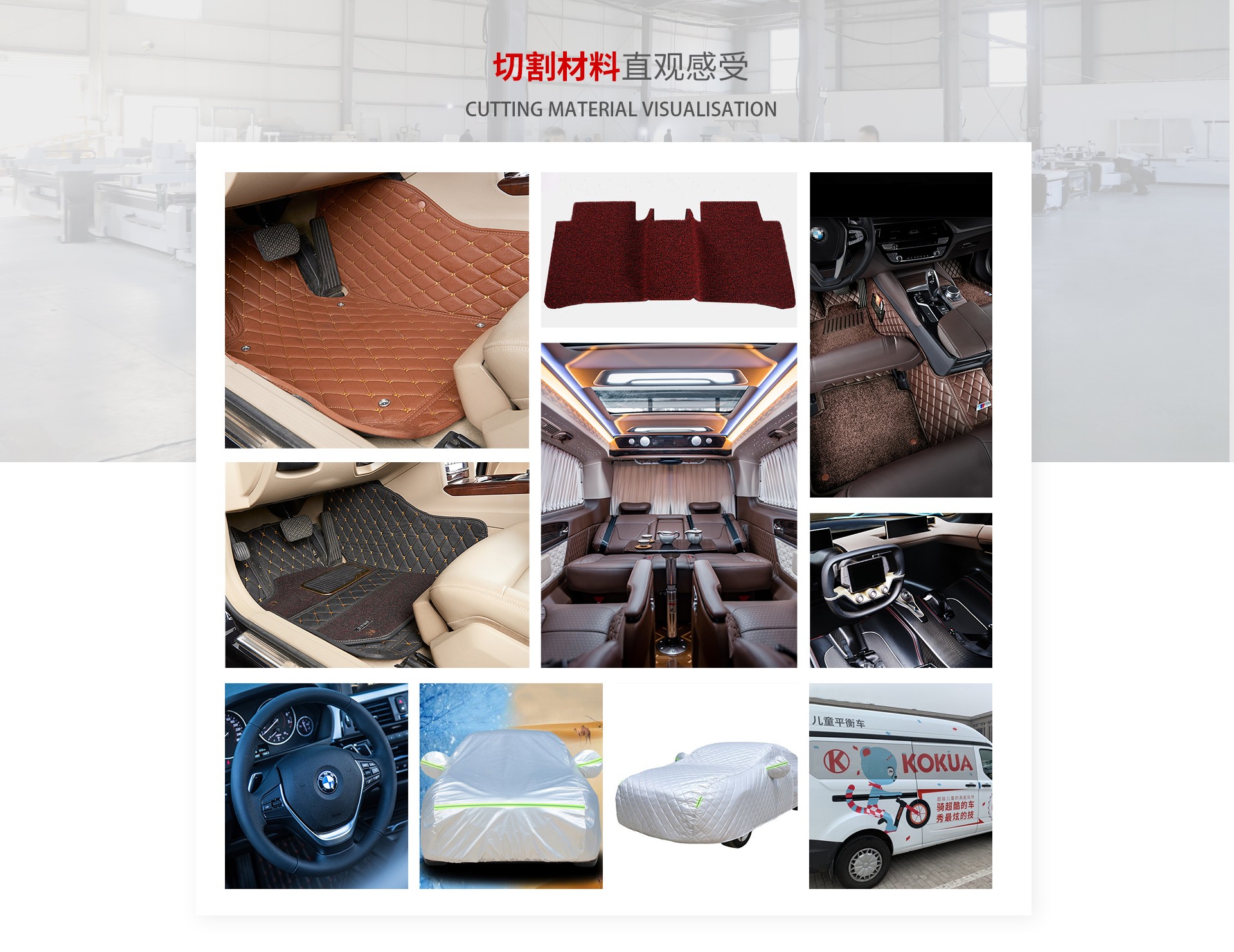 針對汽車用品行業的專車版型的特點卓星切割機為優勢選擇方案。無需大量庫存,根據客戶要求,現場定制,出貨速度快。制作精美無誤差,主要切割全包圍腳墊、大包圍腳墊、絲圈腳墊、汽車坐墊、汽車座套、后備箱墊、避光墊、方向盤套等柔性材料制品。